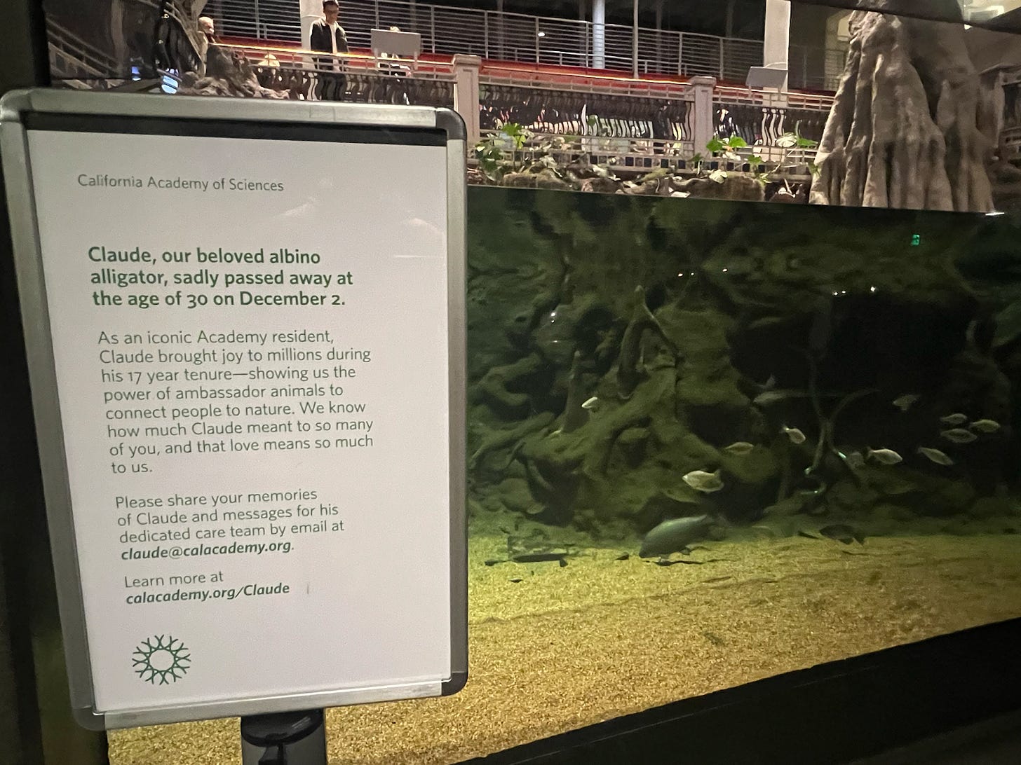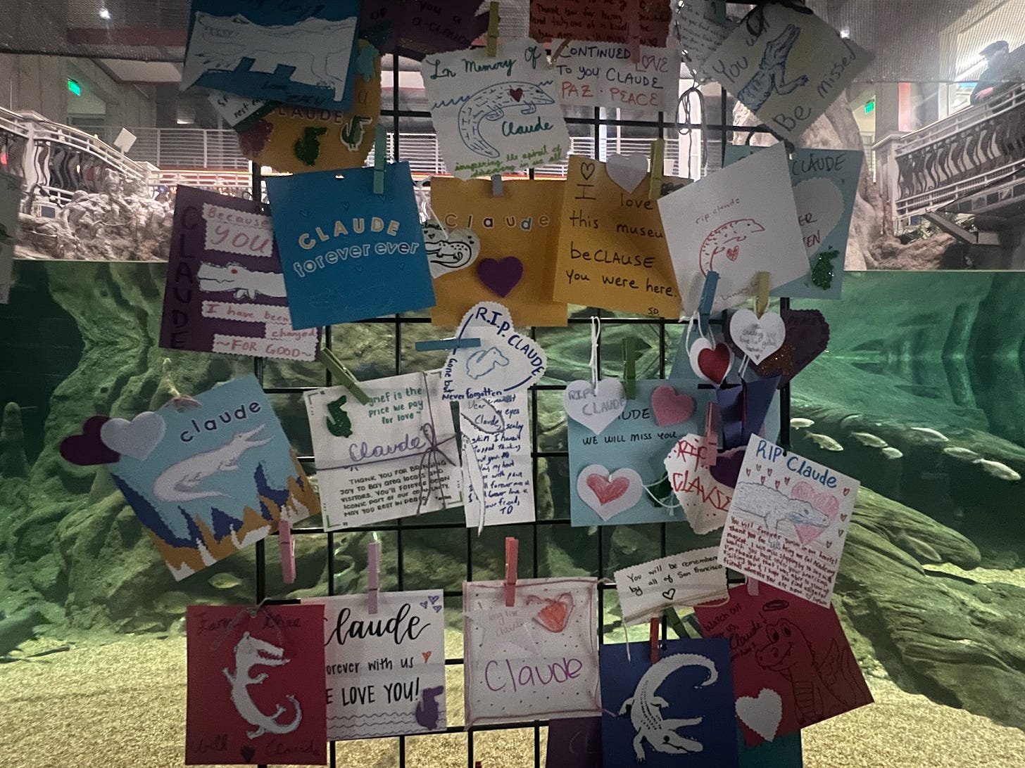 News of Claude’s death led on the evening news. Grief and condolences poured in. Speaker Emerita Nancy Pelosi wrote on X, “San Francisco is heartbroken by the loss of Claude—our city’s distinguished albino alligator who was taken from us in his prime at just 30. Claude was a cold-blooded icon of Cal Academy who connected millions to the wonders of science. Our city won’t be the same without him!”