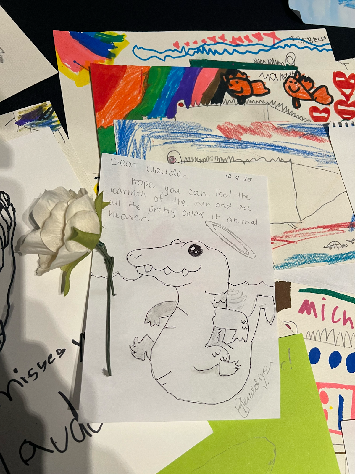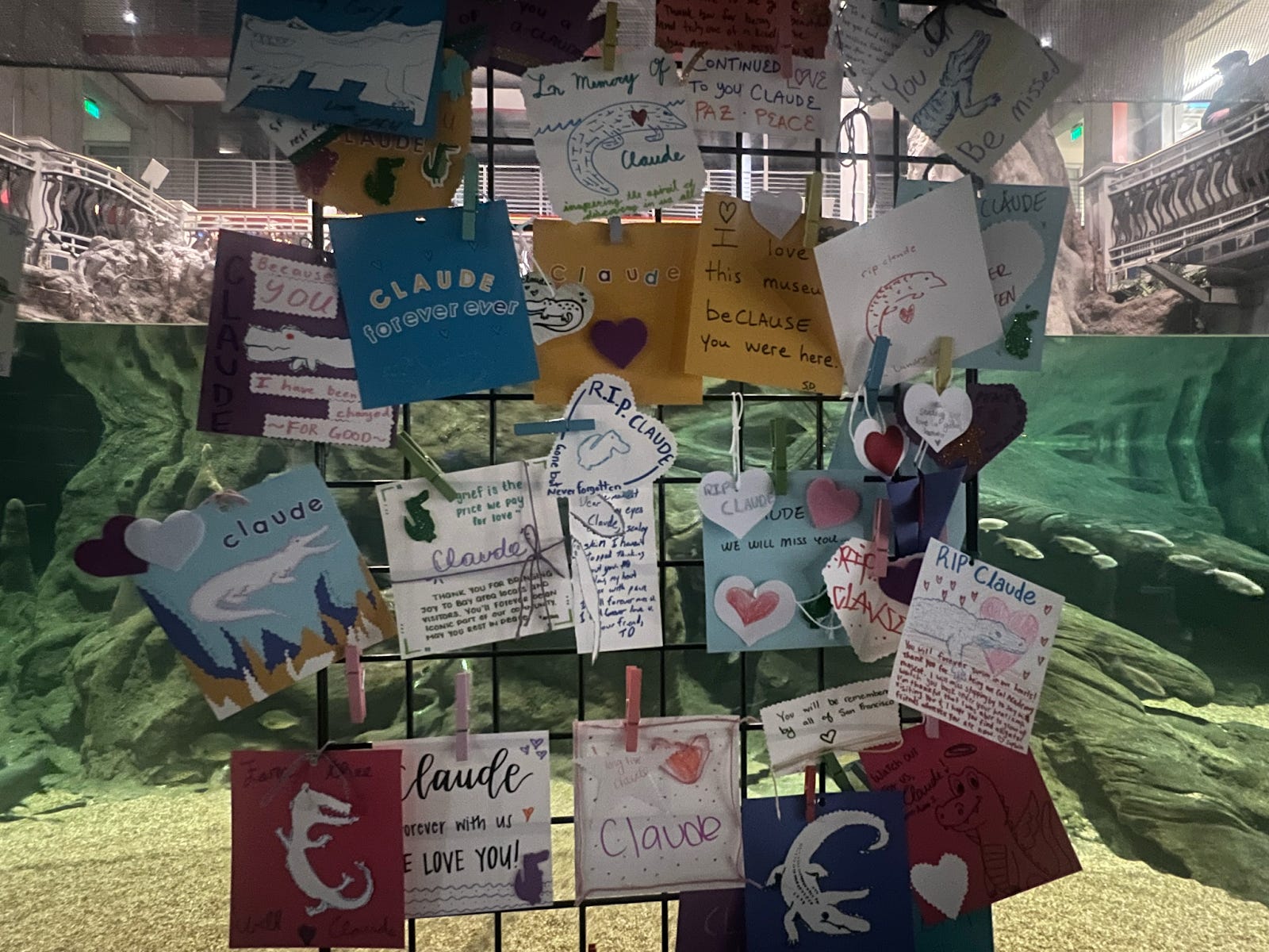 I looked at the cards before leaving. Geraldine wrote, “Hope you can feel the warmth of the sun and see all the pretty colors in animal heaven.” T.O. added, “From the moment I laid eyes on your scaly skin, I haven’t stopped thinking about you. How my heart aches with pain. I will forever miss you. I will forever love you.” Another card showed Claude swimming, with “In memory of Claude, inspiring the spirit of discovery in us all,” written in green marker.
